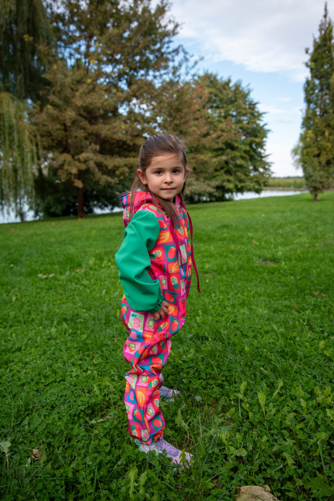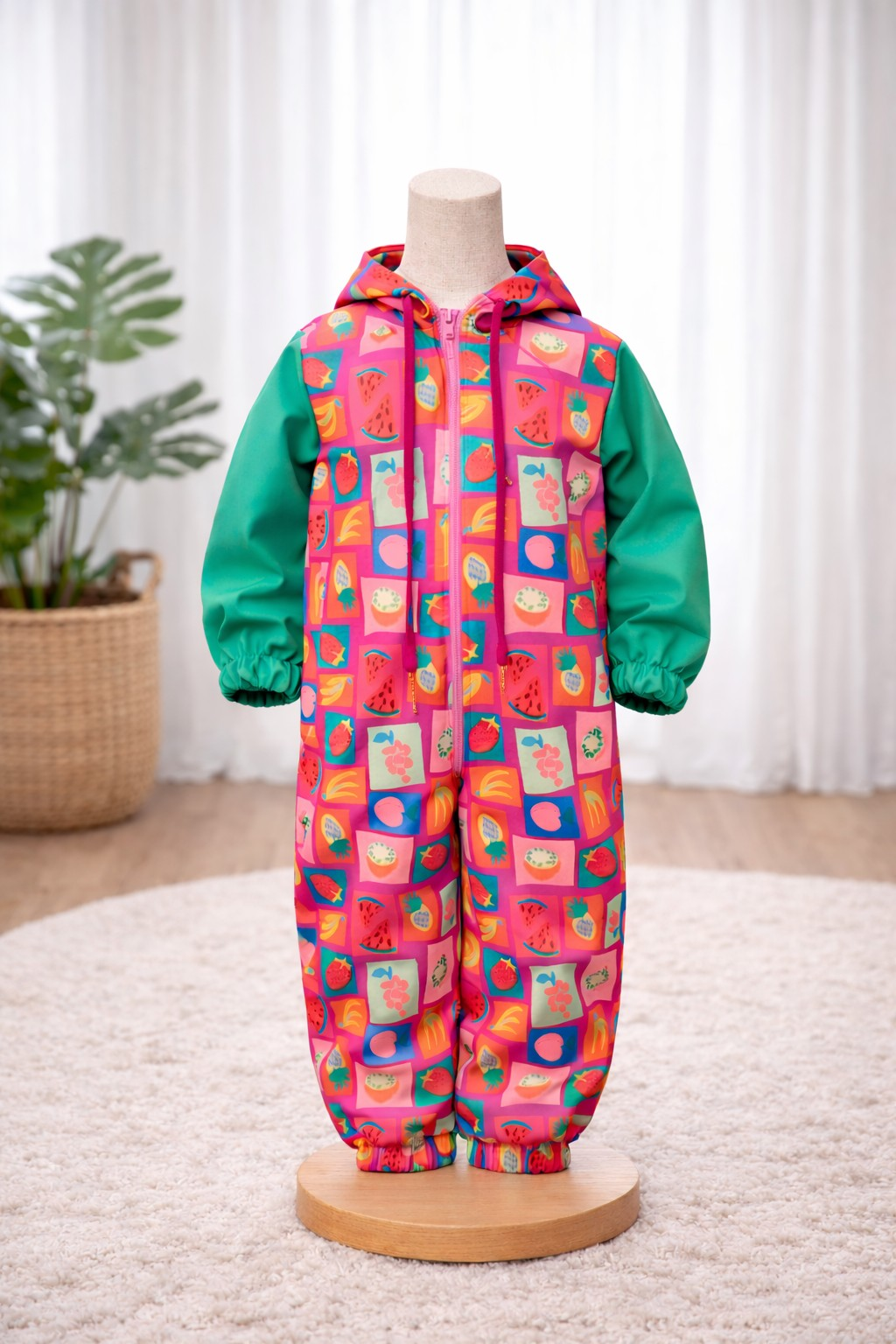 Designul colorat cu imprimeu de fructe adaugă un plus de energie și stil, iar croiala lejeră permite libertate totală de mișcare. Gluga reglabilă cu șnur și manșetele elastice ajută la o fixare confortabilă și protecție suplimentară împotriva frigului.